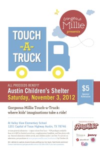 Austin families come support the Austin Children’s Shelter at Gorgeous Millie’s 2nd annual Touch-A-Truck event on November 3rd. Bring your lil’ darlings to see, touch, AND climb into over 20 different vehicles including a fire truck, limousine, ambulance, and police car. There will also be a bounce house, great food, face painting, and a petting zoo. Stop by the Lucky Lil’ Darlings table to make some awesome edible jewelry and meet some of our great Austin crew.