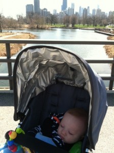 The first nice day we had, I buckled Henry into the stroller, put the leash on the dog, and we set out for a long walk along the lake front. This is by far one of my favorite things about Chicago. Here you are, in a big city, and you can take a long walk along Lake Michigan. It is so peaceful and beautiful, and the people watching isn’t bad either! My other favorite places to walk are around the Peggy Notebaert Nature Museum, through the Lincoln Park Zoo, and through Lincoln Park to see al the sculptures. I’ve also discovered that these long walks make Henry a very sleepy boy! He falls asleep in no time!