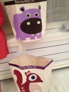 I surprised my sister with two of these for her twins before we knew if she was having girls or boys.  Luckily, the colors and animal pairings offered are perfect for either gender. The coolest part of the Makaboo experience is customizing the gift to the recipient.  I chose a purple hippo & maroon squirrel. Woodland animals are hot now, right? My picks worked out perfectly for the two girls! And the tear jerker…I labeled them “Garvey Baby #1 & Garvey Baby #2”…as they don’t have names yet for the babies, this offered some discretion. I don’t want the competition to start just yet between them!